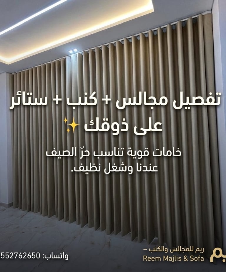 سواء كنتم تبحثون عن تجديد لغرفة المعيشة من خلال صيانة وتنجيد كنب قديم، أو ترغبون في تفصيل ستائر (رول، بلاك أوت، أمريكي) تضفي لمسة من الفخامة على منزلكم، فإن فريقنا جاهز لخدمتكم.
